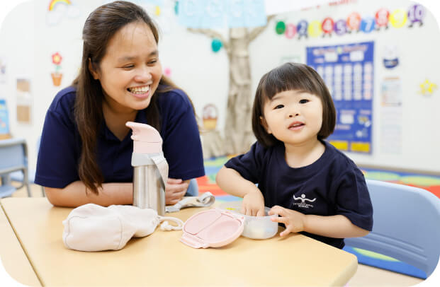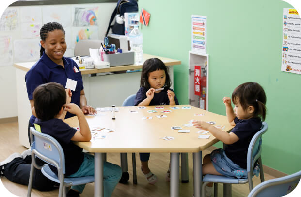 プリスクールコースでは一日を全て英語の環境で過ごし、まるで母国語を覚えるように、自然に言語を習得します。また、英語だけではなく、生活習慣やマナー、考える力、表現力、自律などを大切に外国人教員、日本人アシスタントがペアとなって指導にあたります。